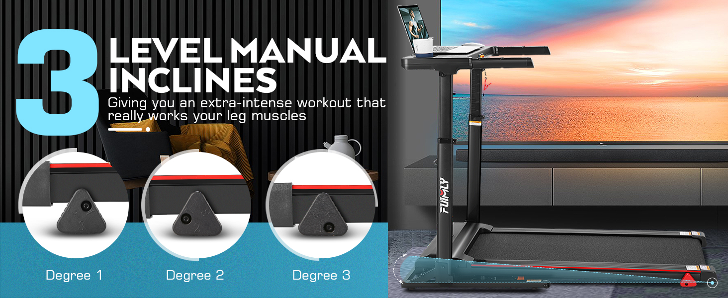 【7-Layer High-Tech Running Belt & 3 Adjustable Inclines】This desk treadmill adopts a 7-layer high-tech non-slip and shock-absorbing running belt, which provide strong cushioning for your knees and reducing the risk of injury.The desk treadmill comes with adjustable incline angles, you can switch them easily by adjusting the base.By adjusting the 0-4% incline of the treadmill, you can burn your muscles faster. The maximum weight capacity of this treadmill is 300 pounds.
